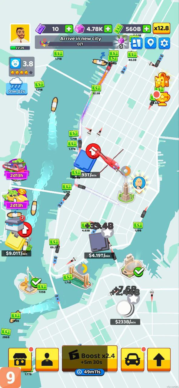 Công ty của bạn sẽ khởi nghiệp ở một khu vực nhỏ của thành phố, với chỉ một chiếc xe. Vận chuyển những hành khách đầu tiên, thu tiền, nâng cấp, mua thêm xe, mở thêm nhiều chi nhánh ở khắp thành phố. Khi công ty đủ lớn, bạn có thể thuê thêm nhân viên, mở auto, lúc này game mới thực sự nhàn rỗi, việc của bạn chỉ là ngắm nhìn dòng tiền, nâng cấp, mở khóa,… và thư giãn.