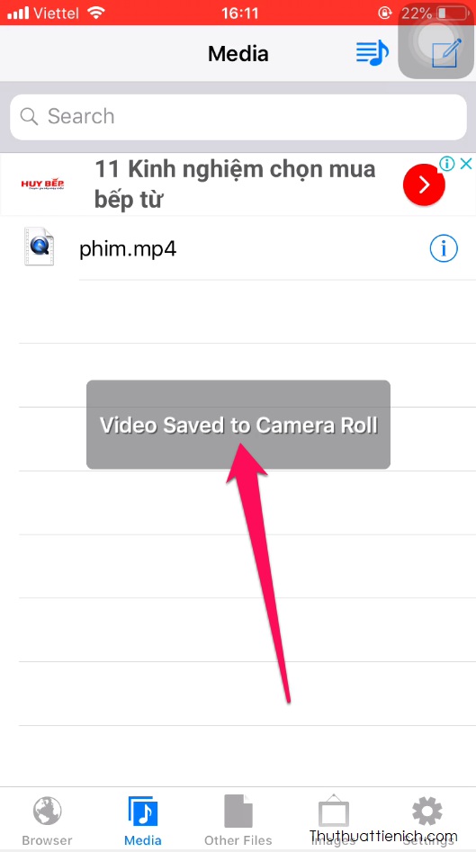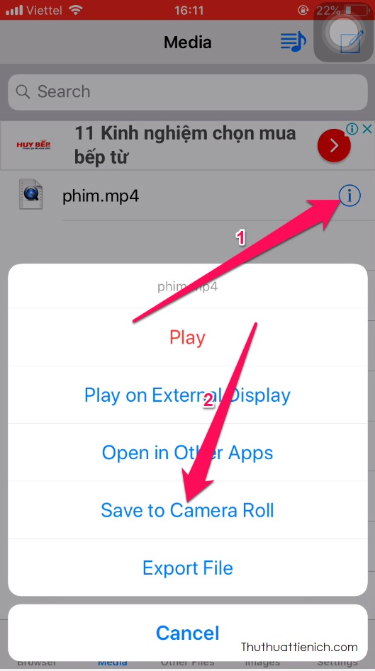 Bước 7: Nếu muốn lưu video vào ứng dụng Ảnh trên iPhone/iPad bạn nhấn nút (i) bên phải video đó chọn Save to Camera Roll, cấp quyền truy cập Ảnh (OK) nếu được yêu cầu.